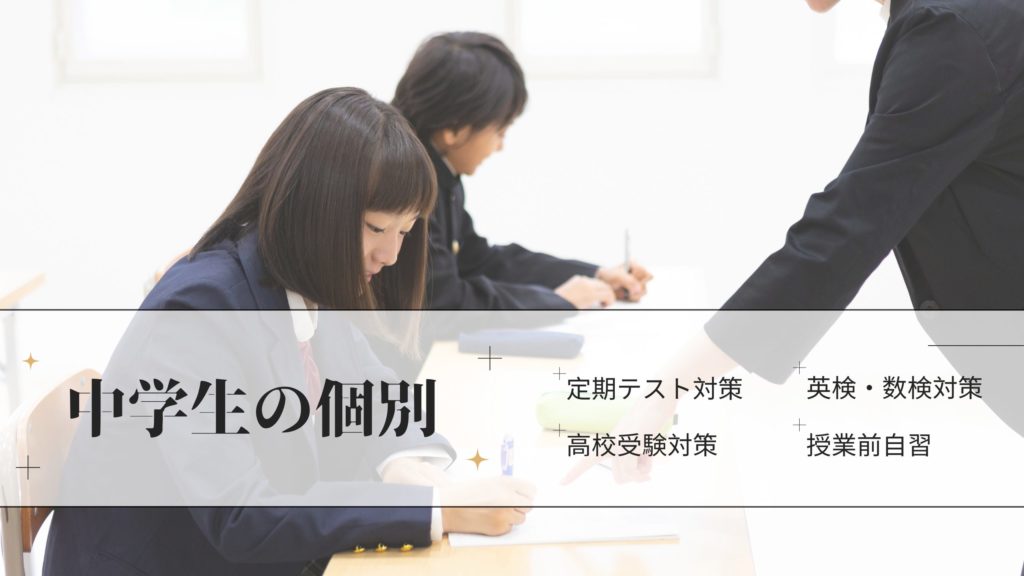 以上の理由は当塾にいる生徒から面談時に聞いた転塾の理由です。学校別に『定期テスト対策』『学力調査対策』『資格対策』の授業をいたします。 授業前に行う自習で前回の復習を行い、授業では学校の進度に合わせて苦手や復習、 場合によっては予習をしていきます。 個別に作られた授業なので、苦手があれば立ち止まって理解をしてから先に進んでいきます。 復習と予習がセットになっているので、効率よく学ぶための仕組みがあります。